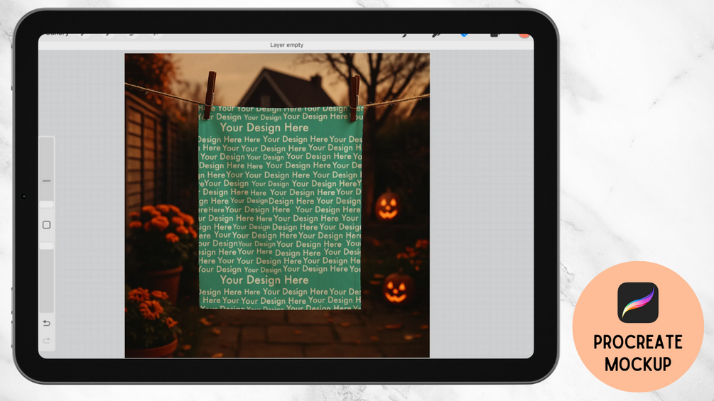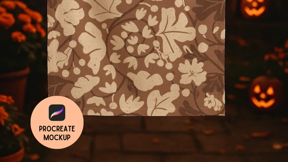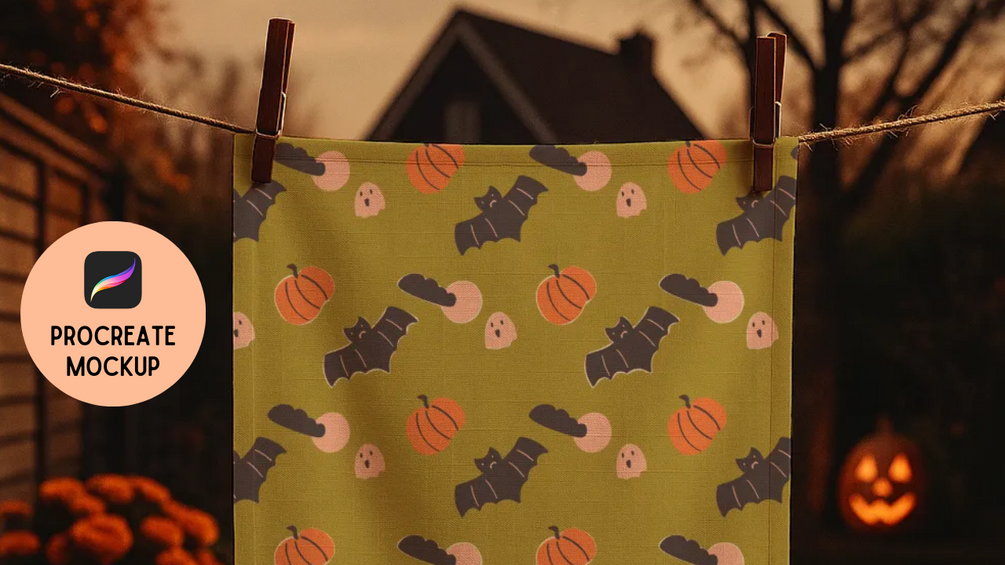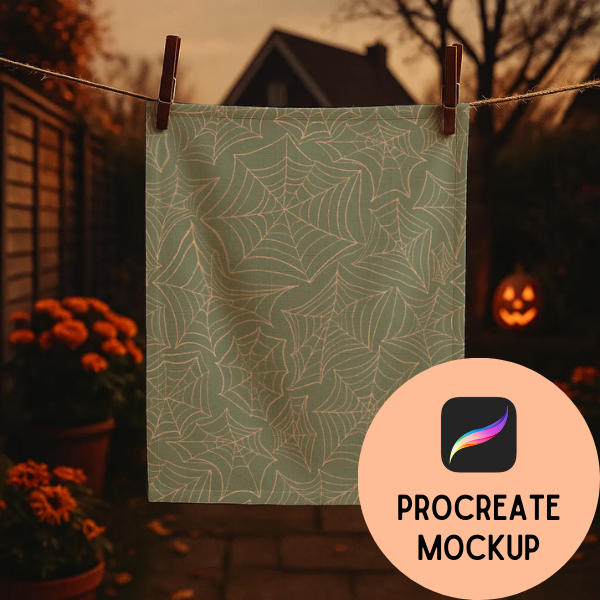 Designed for surface designers and illustrators, this editable Procreate file lets you visualize your patterns on a hanging tea towel in a charming outdoor setting — complete with glowing jack-o'-lanterns and fall flowers.